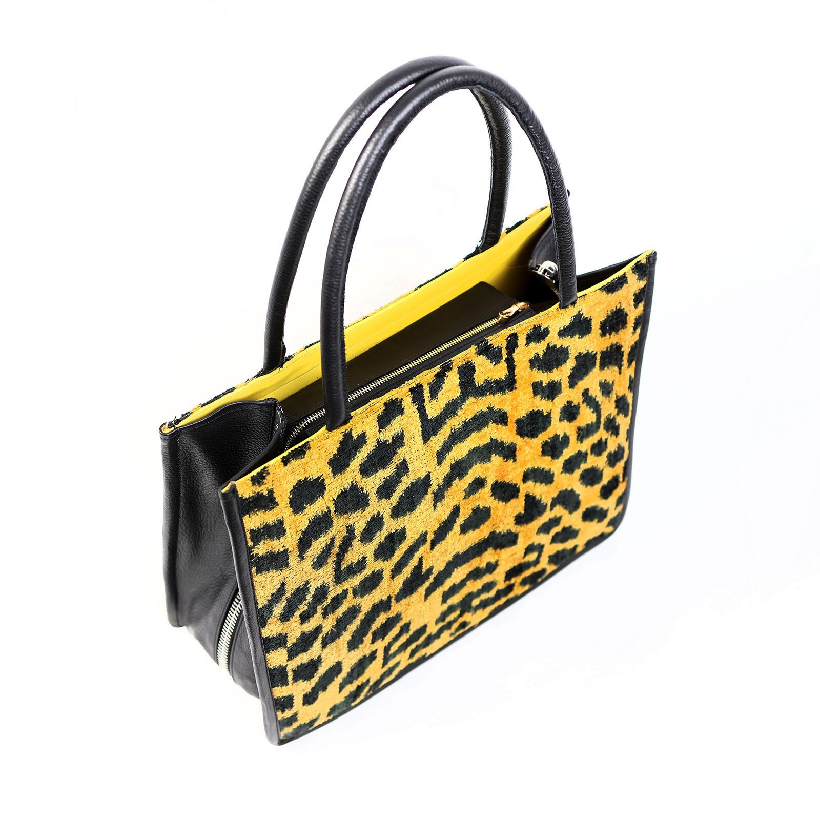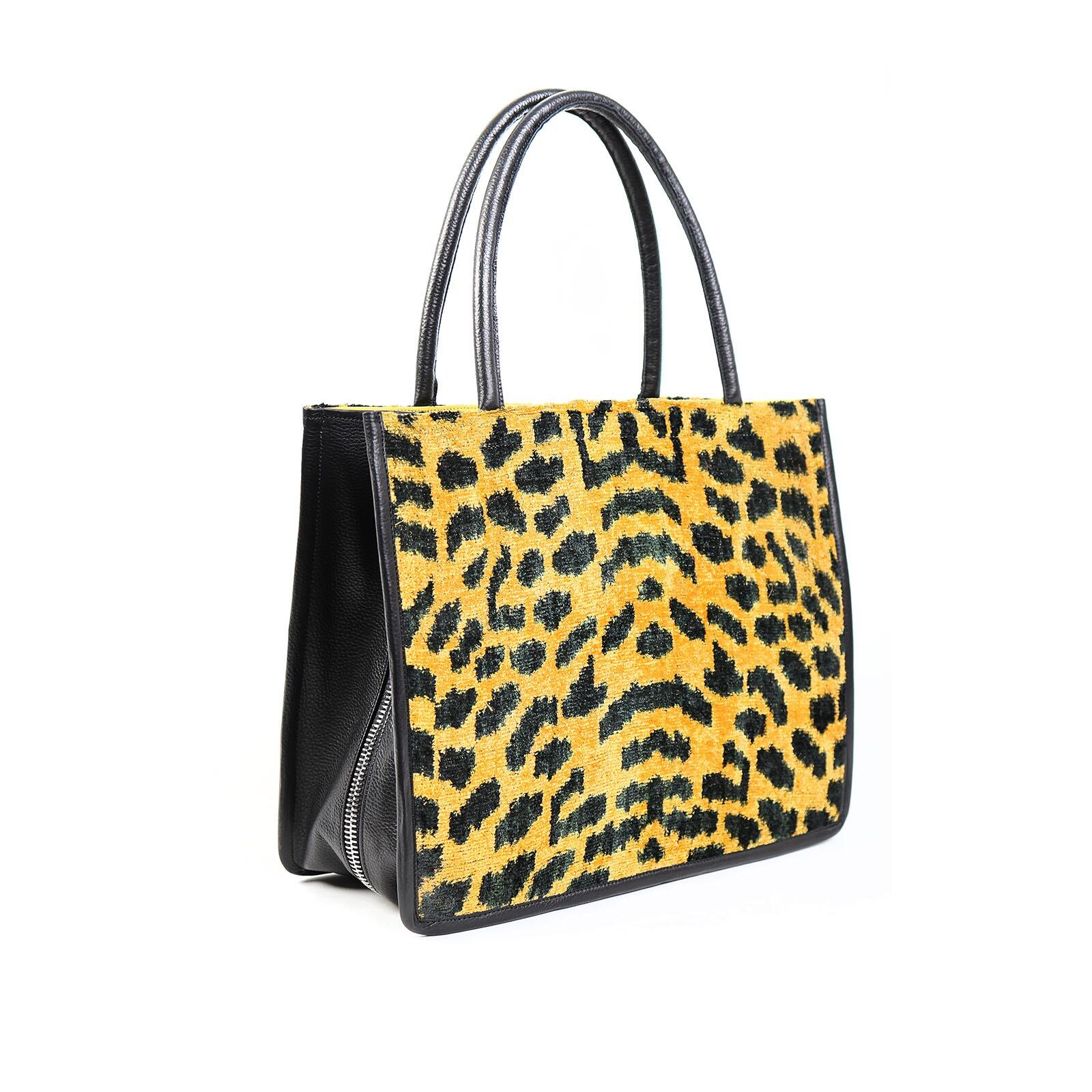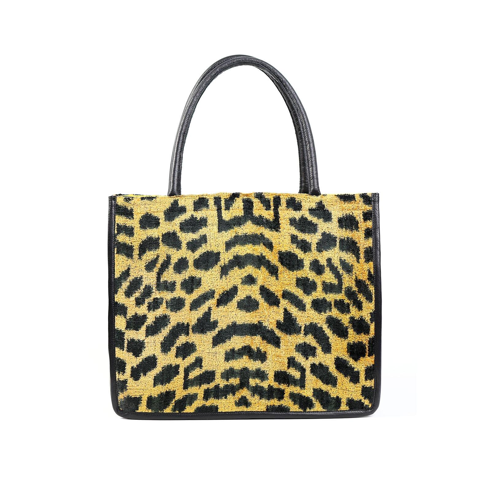The Brooke Leopard Print Women Large Tote Bag is a bold and stylish piece, made from hand-loomed silk with a vibrant leopard print. The bag is framed with durable black leather on the sides and handles, giving it a sleek look. This large tote is perfect for adding a splash of fun to your wardrobe while being practical enough to carry all your day-to-day items. Whether you’re out shopping or heading to work, this bag combines traditional craftsmanship with a trendy design to make a statement.