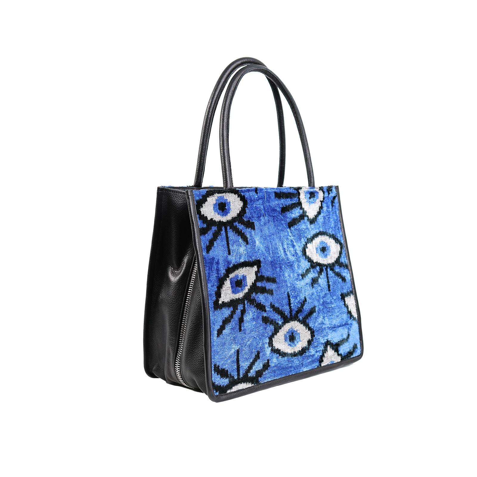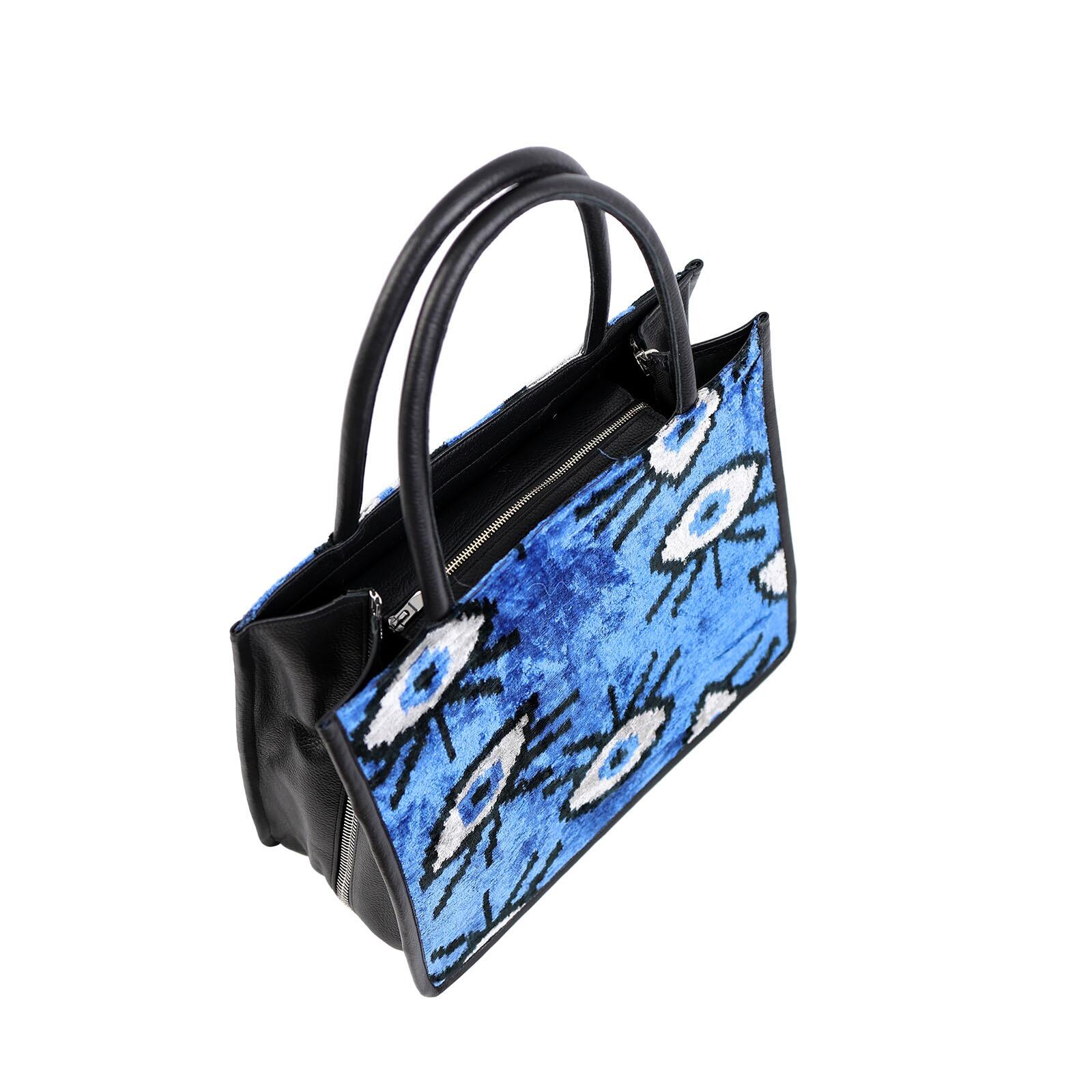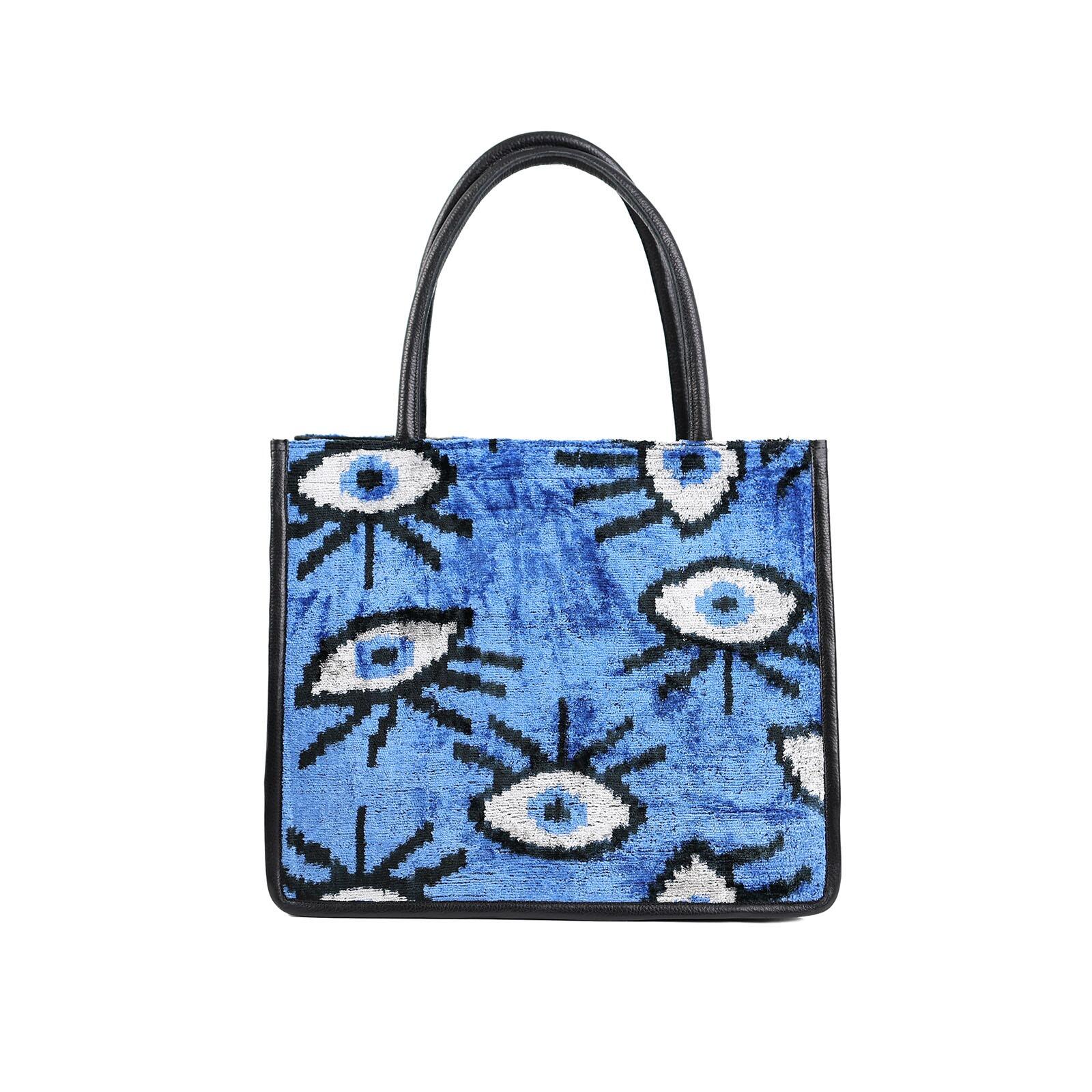 The Maeve Blue Eye Pattern Women Large Tote Bag is a striking example of unique style and craftsmanship. This bag features an eye-catching blue eye pattern on hand-loomed silk, showcasing vibrant hues and intricate details that make it a standout accessory. Paired with luxurious black leather sides and handles, the Maeve Tote offers a perfect balance between durability and distinctive aesthetic appeal.