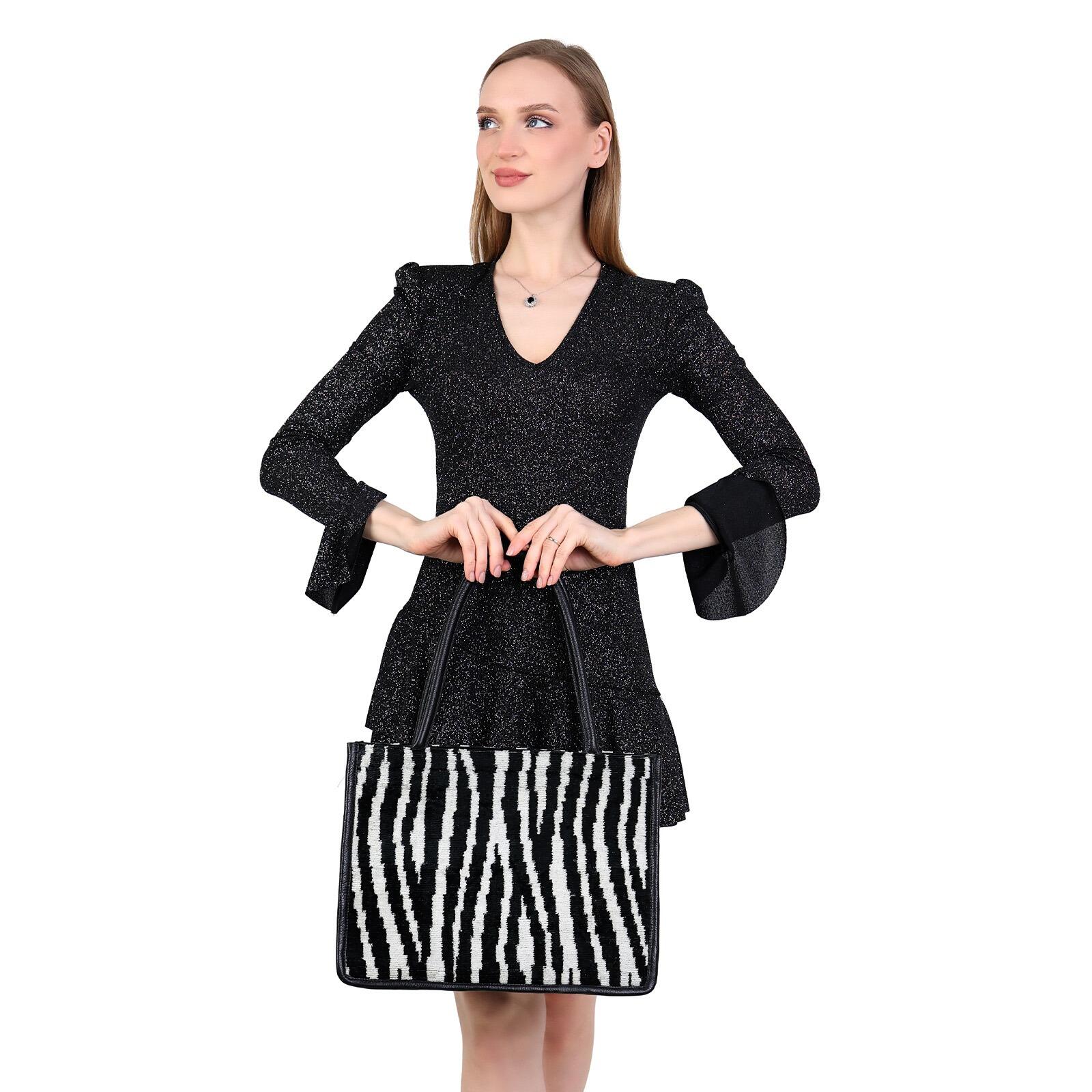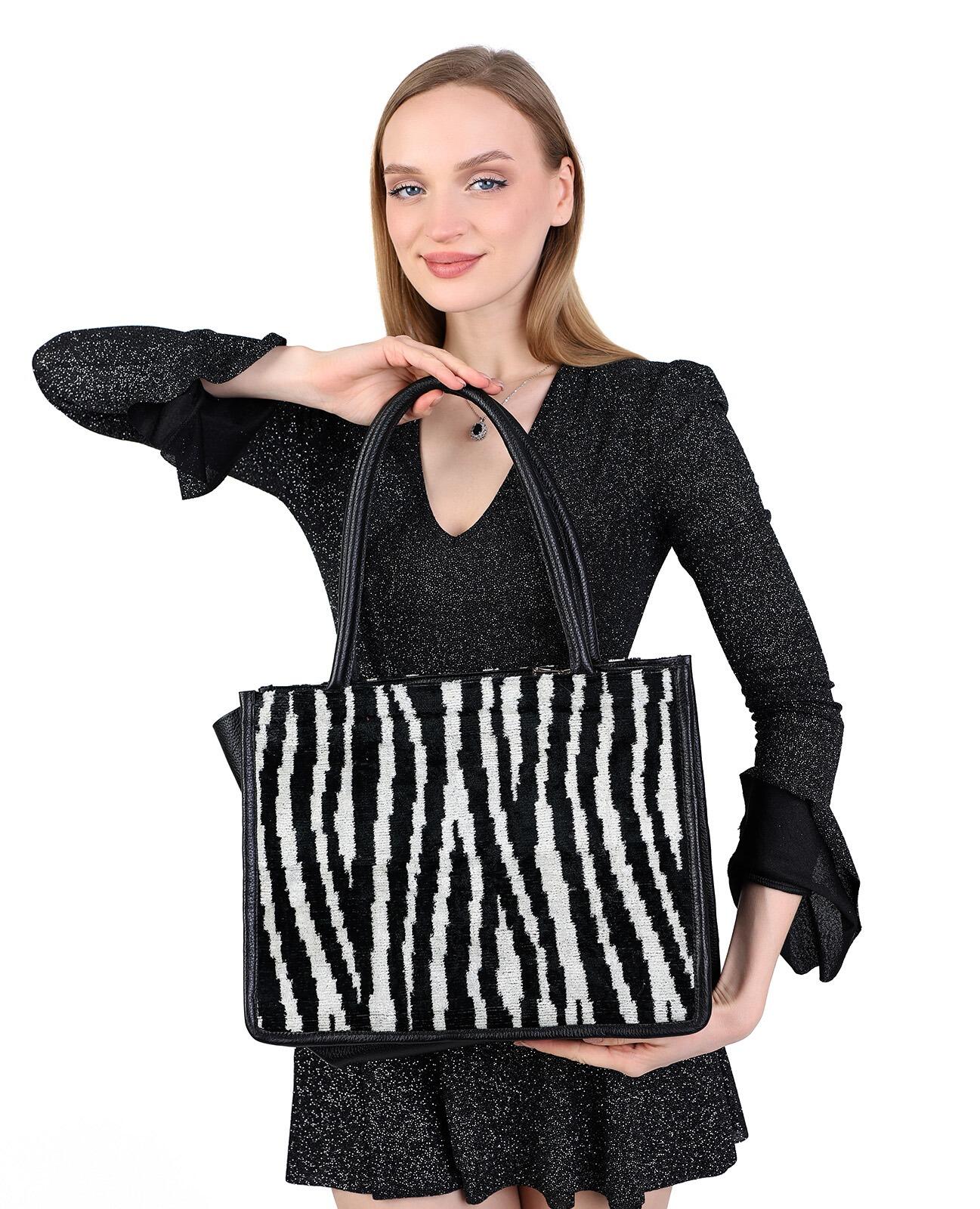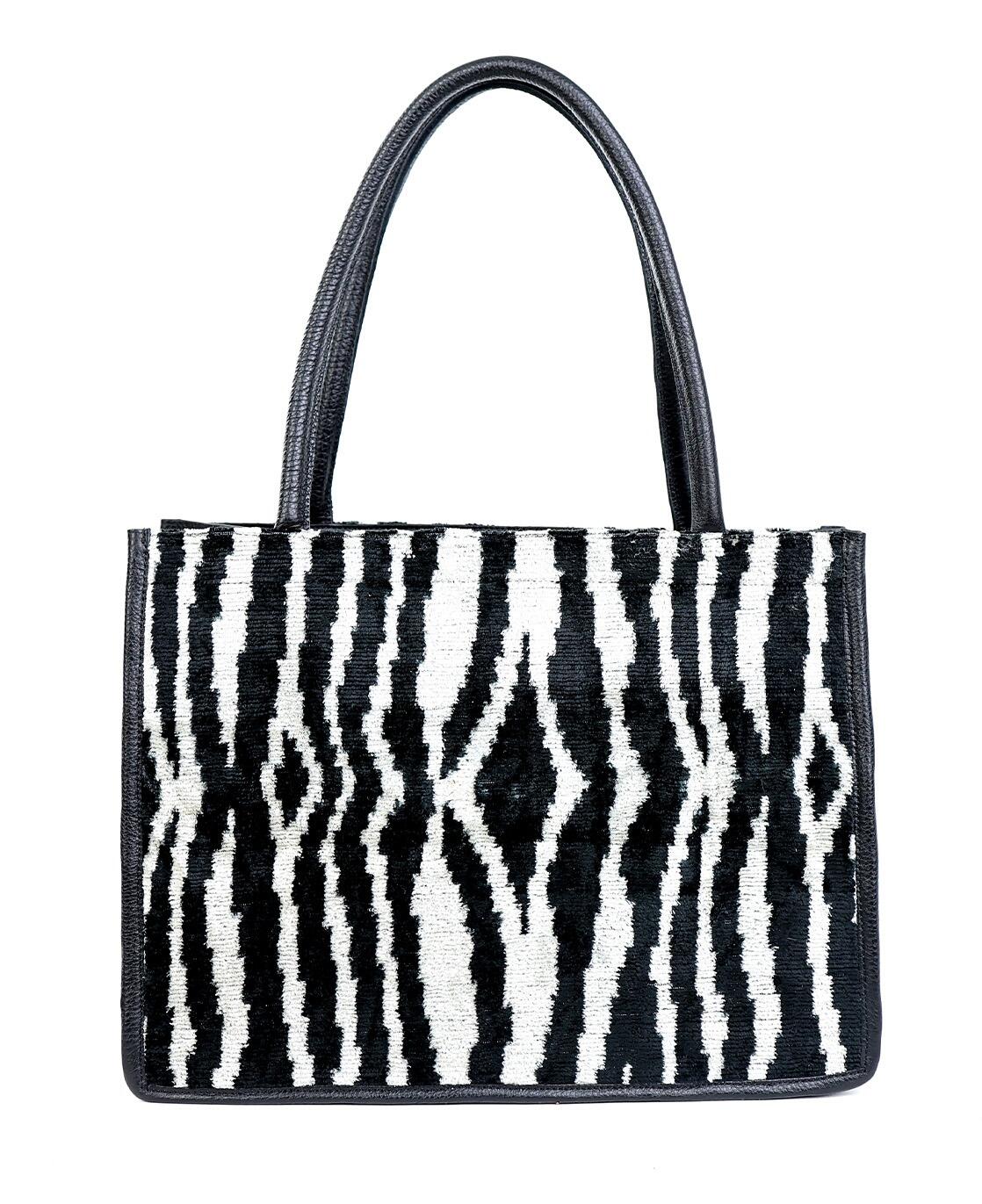 The Zahara Black Zebra Print Women Medium Tote Bag is a striking blend of the wild and the refined. Hand loomed silk fabric with a bold zebra print graces this bag, setting a dynamic tone with its classic black and white stripes. The texture of the silk adds a tactile dimension to the visual appeal, while the solid black leather provides structure and a luxurious feel.